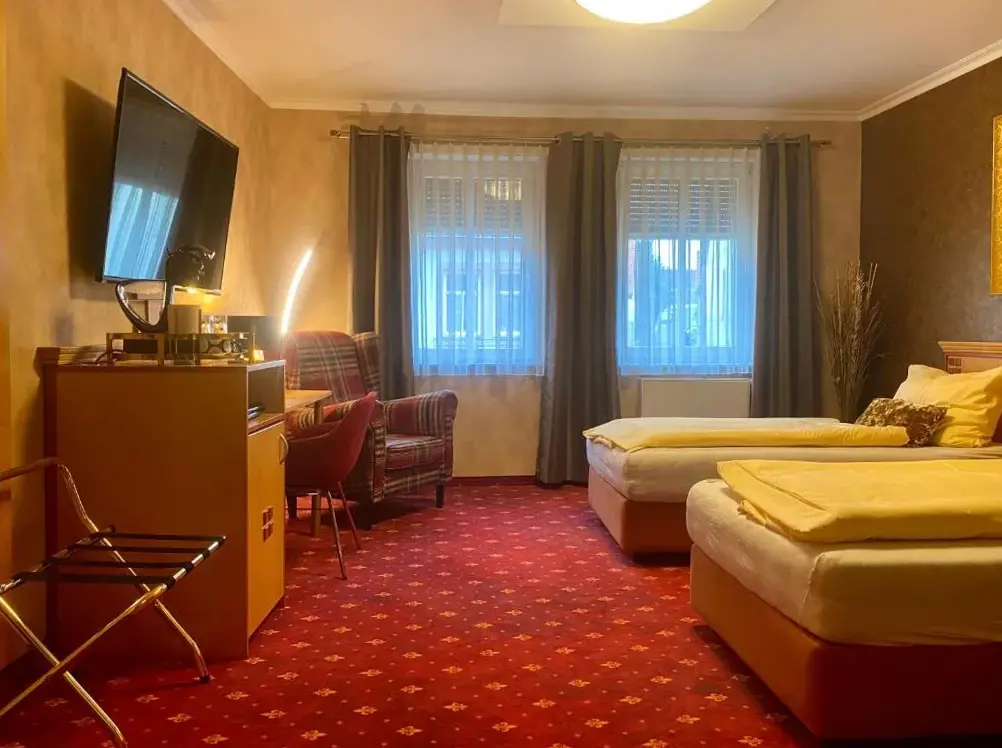 Das familiengeführte Hotel Querfurter Hof liegt in der Merseburger Straße 06268 Querfurt und bietet seinen Gästen moderne Zimmer mit eigenem Badezimmer, einem Schreibtisch sowie einer Minibar. Die Zimmer sind mit holzigen Möbeln und Teppichboden ausgestattet und präsentieren sich in einem frischen Farbschema. Im traditionell eingerichteten Restaurant des Hotels genießen Gäste regionale Spezialitäten und können zudem ein Frühstücksbuffett für einen Aufpreis genießen. Eine kleine Bar lädt zum Verweilen ein. Das Hotel verfügt über kostenlose Parkplätze und kostenloses WLAN. Zu den nahen Sehenswürdigkeiten gehört das historische Schloss Querfurt, welches etwa 2625 Fuß vom Hotel entfernt liegt. Wanderer und Radfahrer profitieren von der idyllischen Umgebung, die ideal für Ausflüge geeignet ist. Nahe gelegene gastronomische Angebote umfassen Pizzerie la Park sowie Basilikum Naturkostbar.